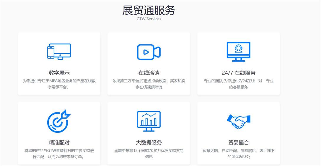 “展貿(mào)通”(Global Trade Week,簡稱GTW) 是線上的“展覽館”,為全球展覽主辦方提供“數(shù)字展覽”解決方案。 通過互聯(lián)網(wǎng)的平臺、流量、營銷、互動、分析等能力,為線下展會場景做延續(xù)和擴(kuò)展,讓互聯(lián)網(wǎng)成為線下展會的前后端。